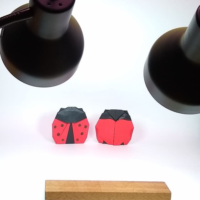 When folded from red-black paper, the owl side has a black head and feet just above the folded wings. The ladybug side has a black abdomen showing between the wing shields.
