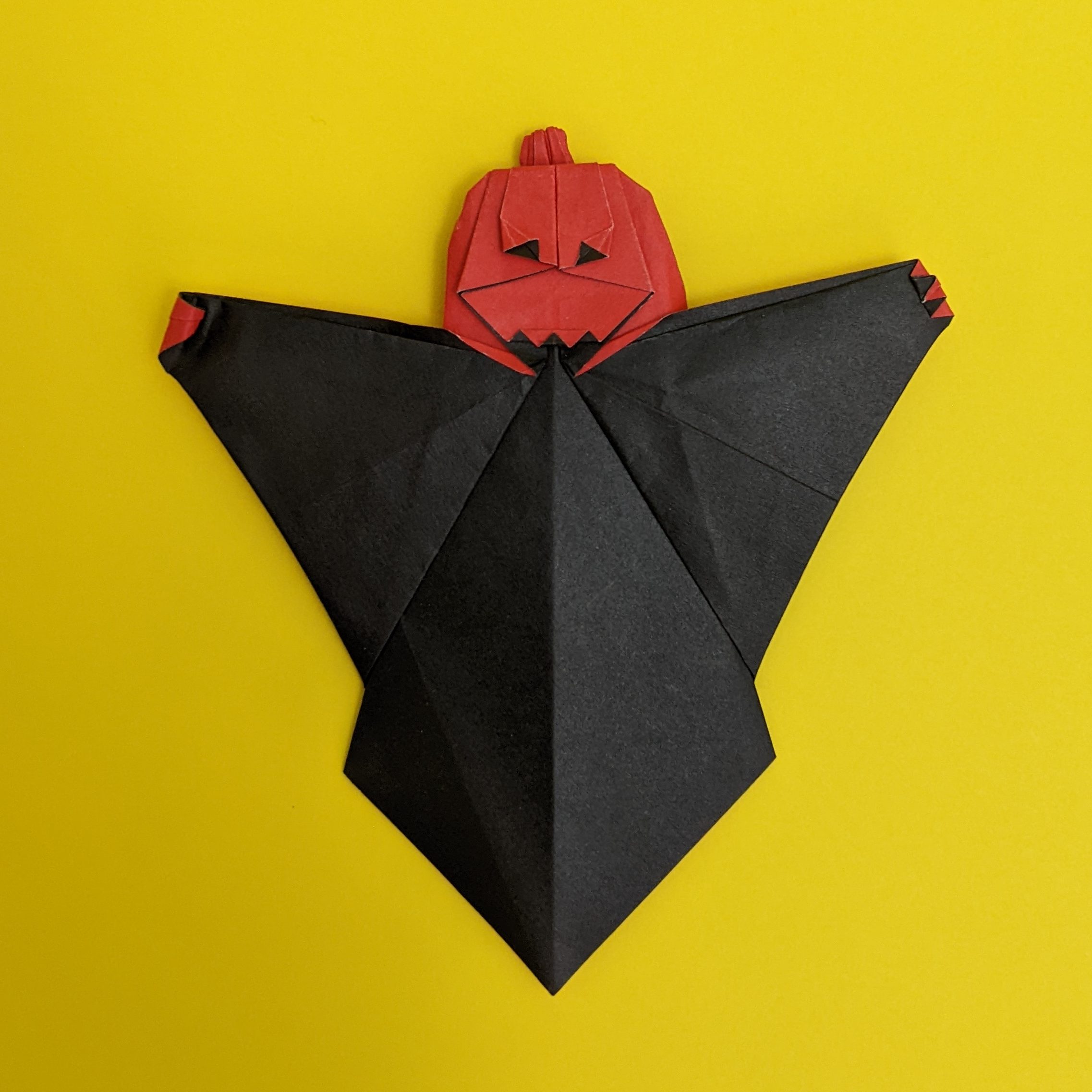 This playful model, when folded from red-black paper, yields a ghost with a Jack-O-Lantern head. Great origami play, and theater, and Halloween!