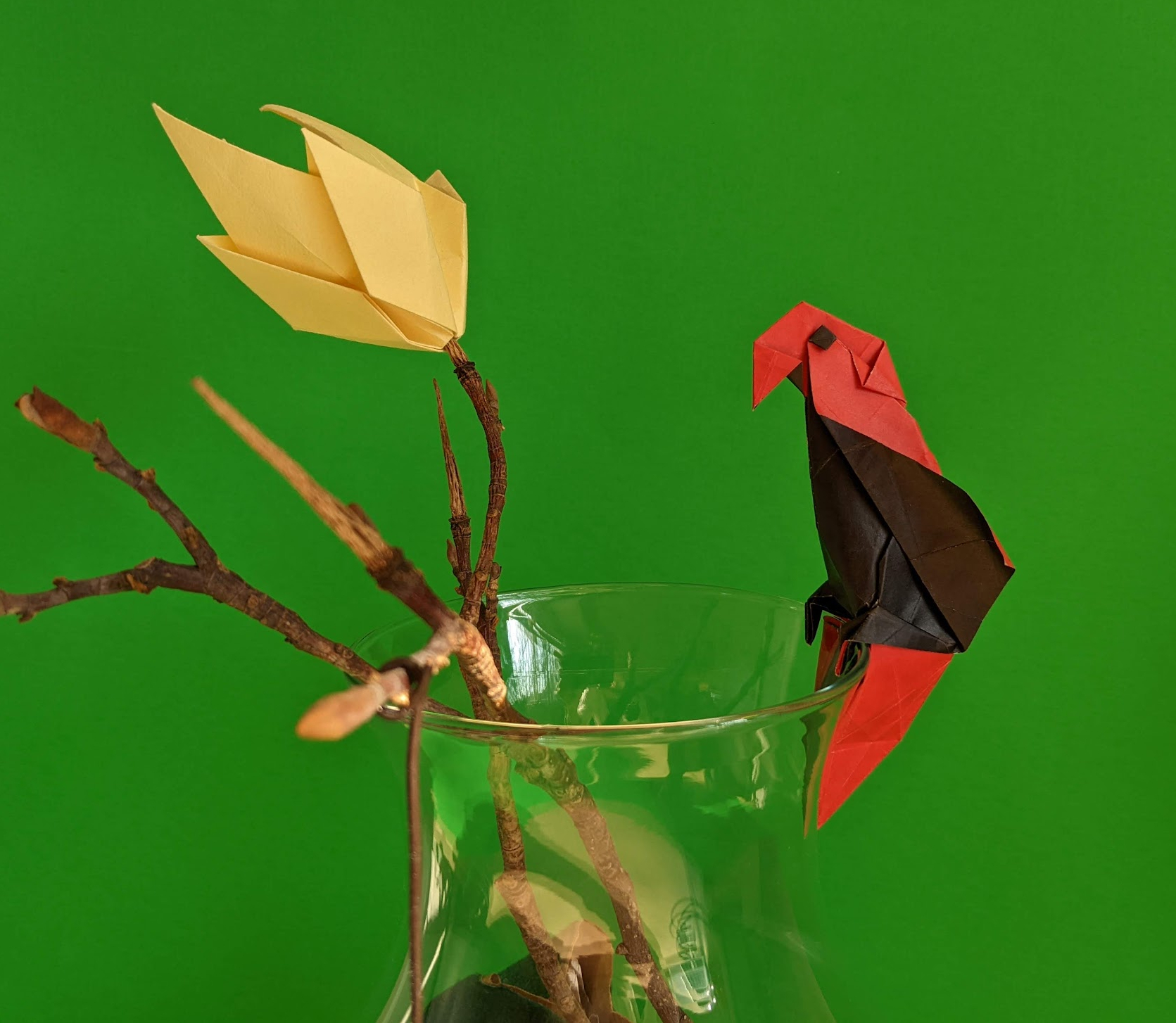 This parrot has strong claws. Thus, it can perch in various positions. It can perch on different types of vases. The folding sequence has some tricky steps, explained in the YouTube tutorials below.